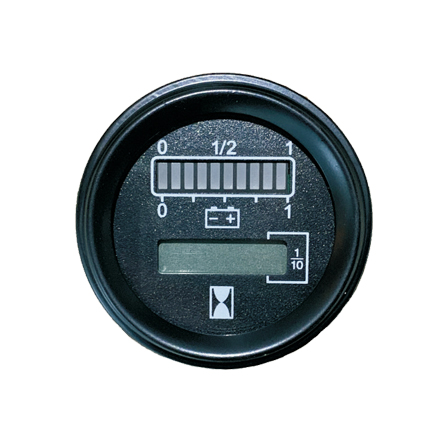 它主要由一塊液晶小時計儀表及十個電量狀態(tài)指示LED組成。液晶小時計儀表主要積累顯示車輛工作小時,十個狀態(tài)LED指示當前蓄電池的剩余電量。
